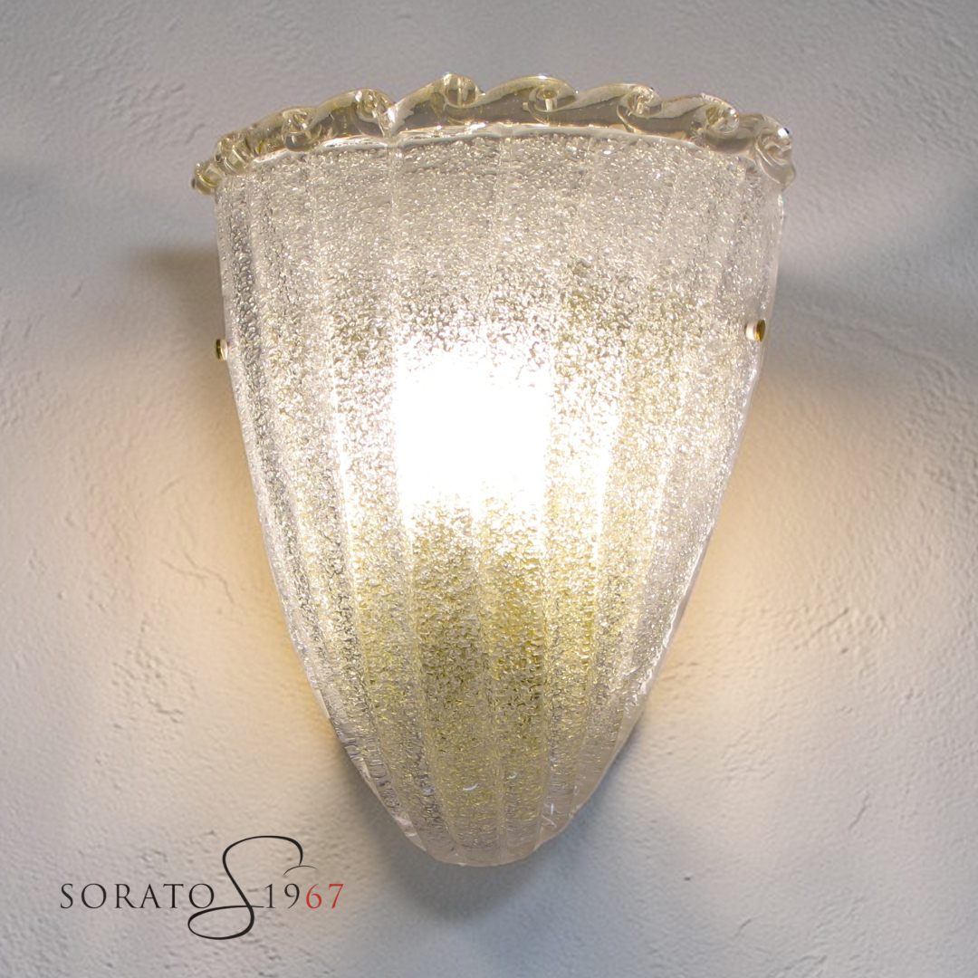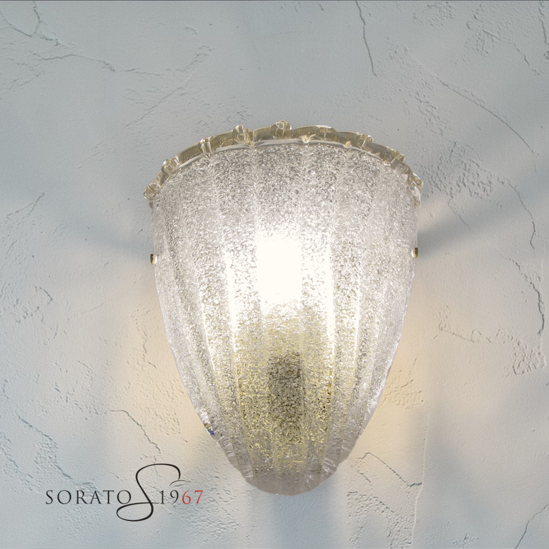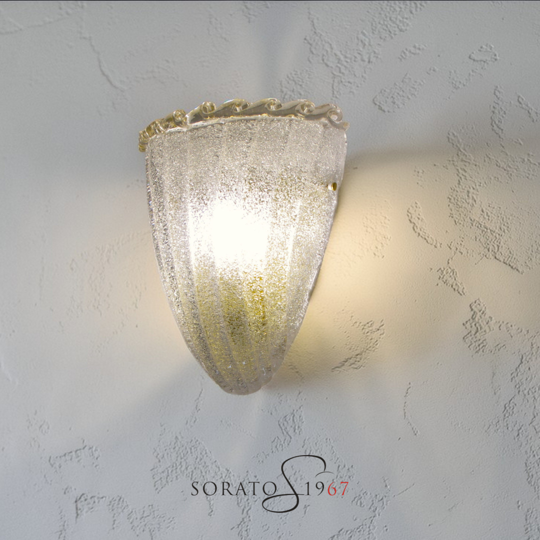 Vetro di grande pregio, realizzato nell'entroterra veneziano secondo le tecniche e le lavorazioni del miglior artigianato muranese. La parte interna del vetro si caratterizza per la fine graniglia vitrea, che dà al diffusore particolare brillantezza. La finitura ottone dell'attacco a parete dona al vetro l'aspetto "caldo" visibile in foto.
