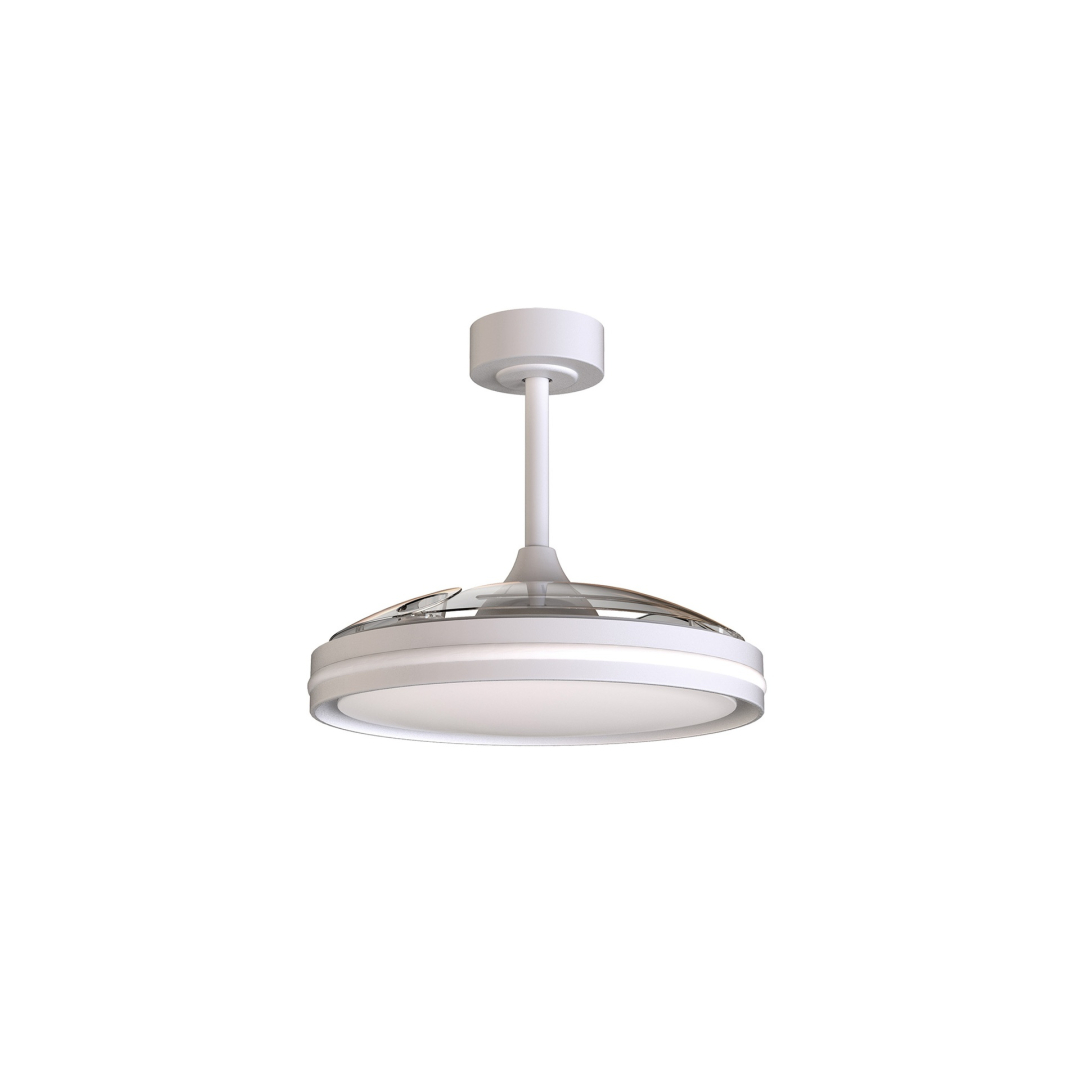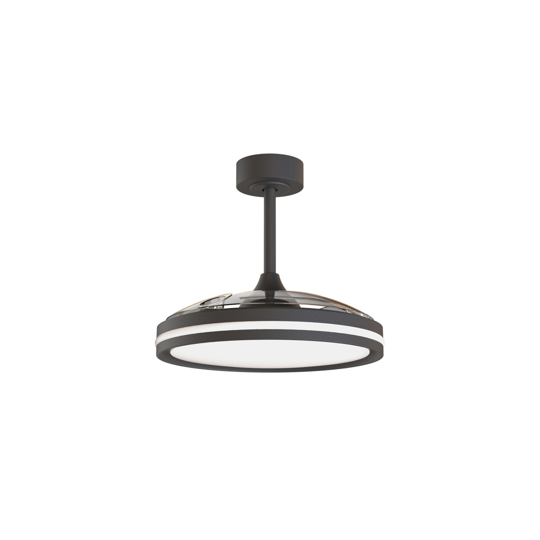 Ventilatore Mantra North con pale disponibili nelle colorazioni bianco o nero. Lampada dal design moderno e con funzioni smart controllabile dal telecomando o dall’apposita app.