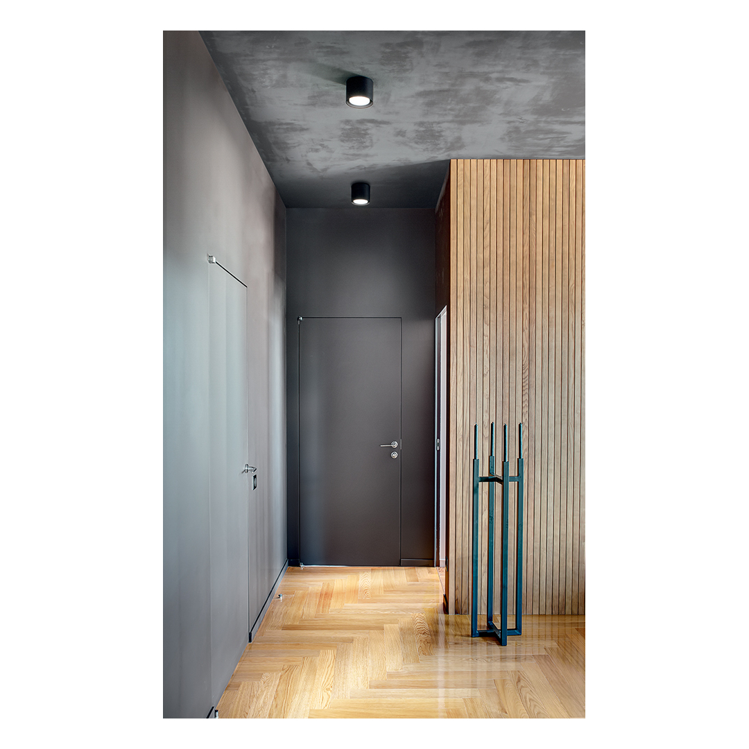 Plafoniera cilindrica in alluminio verniciato a polvere, disponibile in colori bianco opaco e nero opaco.