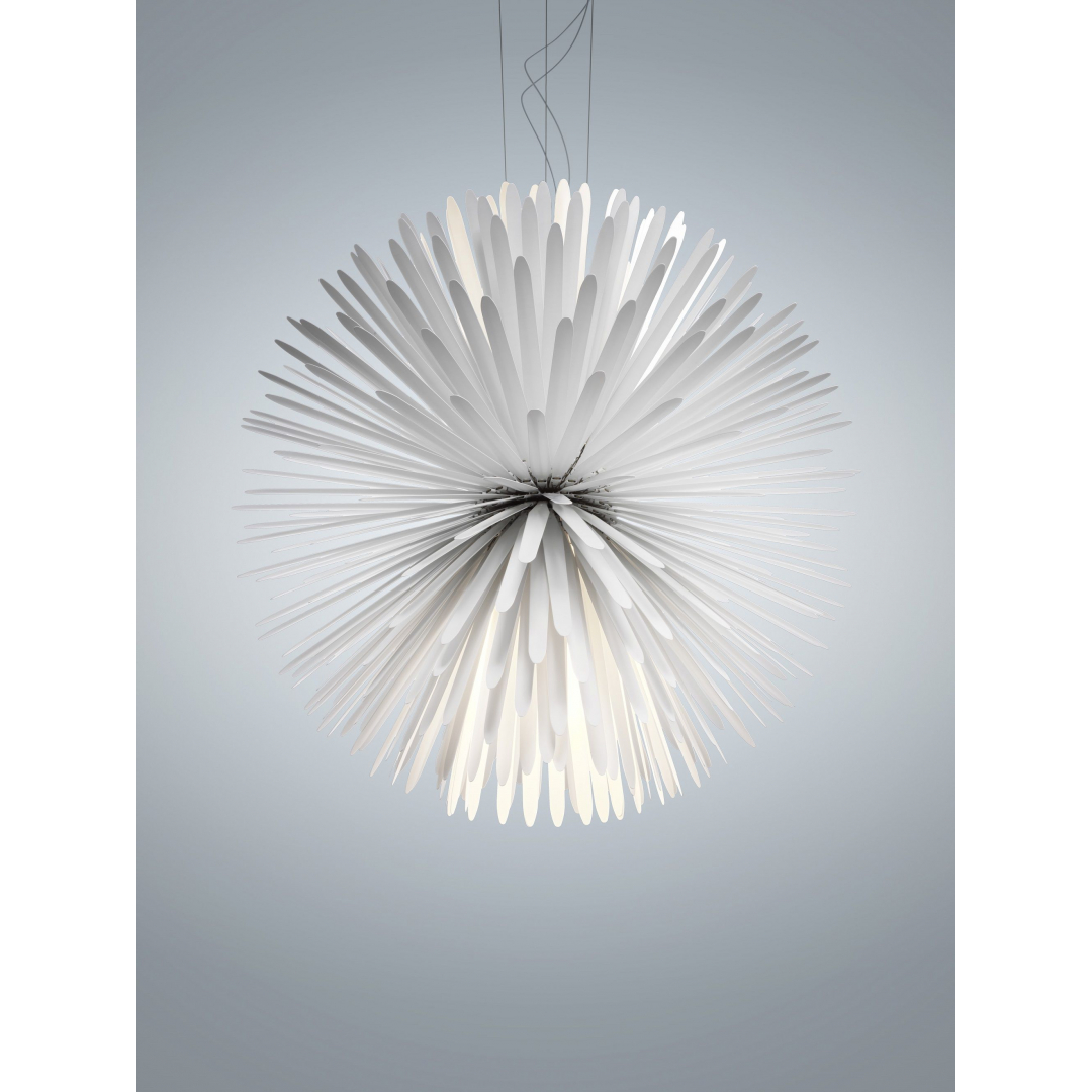 "Lampada da sospensione a doppia illuminazione diretta e indiretta. II corpo illuminante è formato da 390 raggi in acciaio stampati a