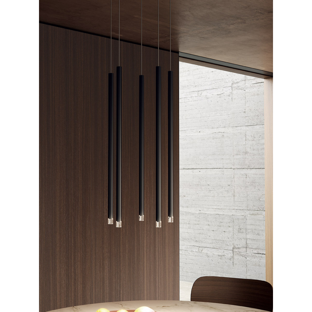 A-Tube Nano è una lampada a sospensione che interpreta la luce nella sua forma più essenziale disegnando una sottile linea luminosa nello spazio abitativo. All’estremità inferiore della leggera struttura in alluminio, un diffusore in metacrilato trasparente ospita un modulo LED la cui luce crea un’atmosfera morbida e avvolgente. “ (dal catalogo del produttore).