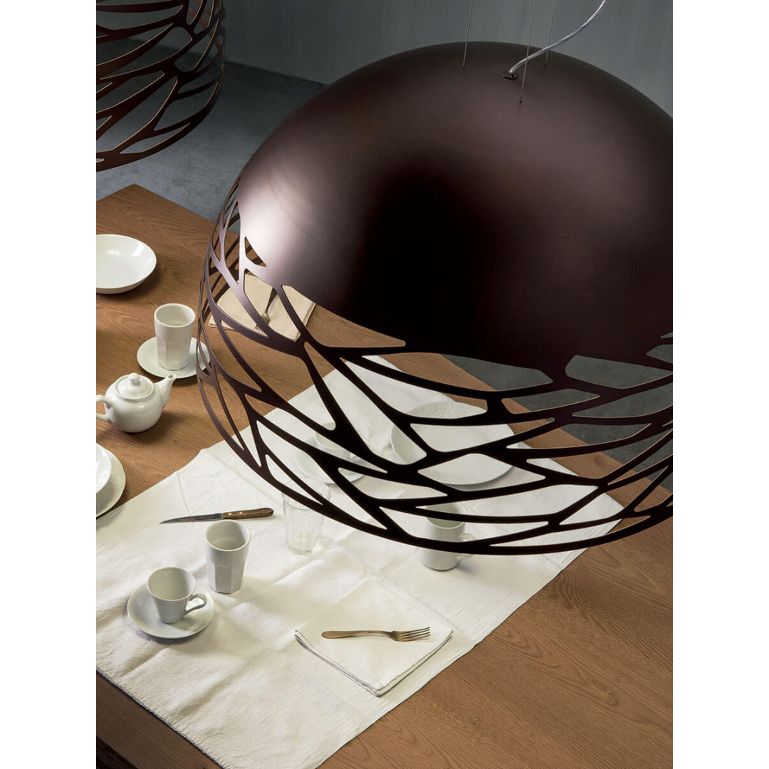 "Una bellezza seducente dalla personalità audace grazie a tagli laser forti e precisi che alleggeriscono il metallo del paralume e creano un intrigante gioco di luci e ombre. Kelly è una famiglia poliedrica di lampade a sospensione e a parete che si distingue con eleganza in ogni ambiente abitativo grazie alla varietà di forme e finiture disponibili.“ (dal catalogo del produttore).