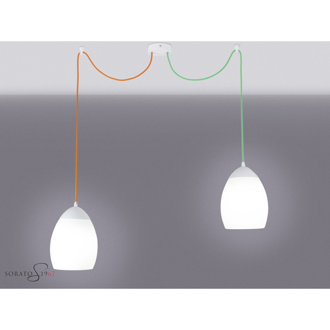 Sospensione composta da due pendenti in vetro soffiato bianco satinato, che si caratterizza per la diffusione luminosa ottimale e dall'effetto "morbido", senza ombre marcate.