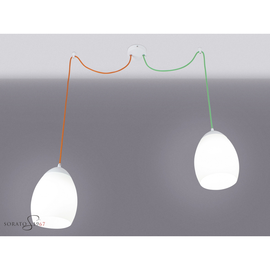 I due pendenti, forniti ciascuno con cavo elettrico di lunghezza 250 cm., sono di installazione libera rispetto al punto luce, tramite due decentratori da fissarsi a soffitto con un normale tassello. Il punto luce viene chiuso da un apposito coprifilo. Tutte le parti metalliche sono in color bianco.