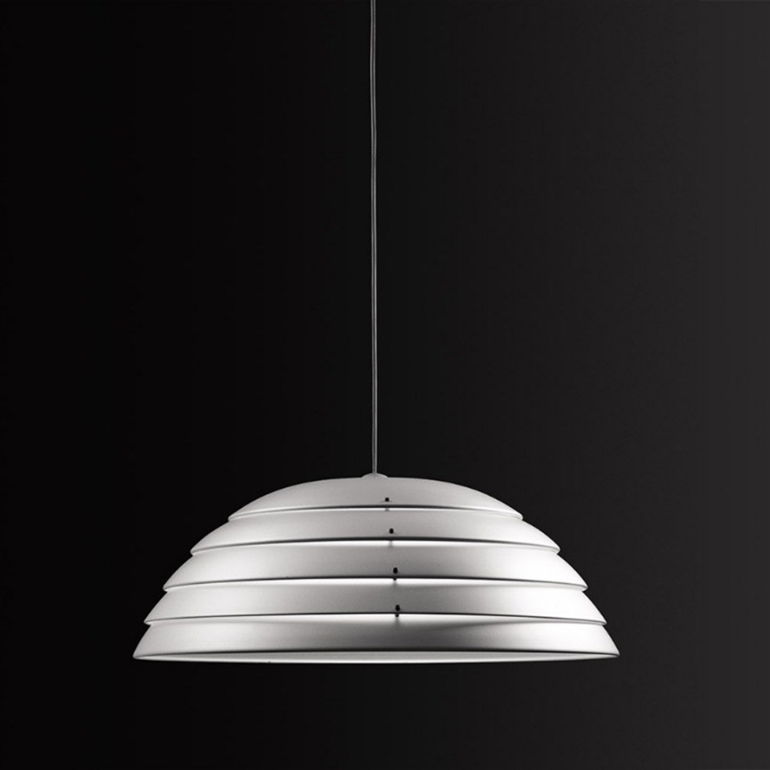 Lampada a sospensione a luce diretta. Struttura in alluminio formata da cinque elementi sovrapposti, fissati con pomellini, verniciata nel colore bianco o dorato.